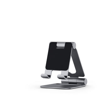 The Satechi Foldable Aluminum Stand elevates any mobile device to a modern workstation for your home office or on-the-go. A perfect balance of sleek and sturdy, it's constructed from solid aluminum with protective pads in all the right places and adjustable hinges to provide an optimal angle across a variety of devices. Whether its streaming home workout videos on your iPad, or joining family FaceTime calls on your iPhone, the Aluminum Foldable Stand creates an ideal setup for easy viewing. And it easily folds up to store away or take with you.